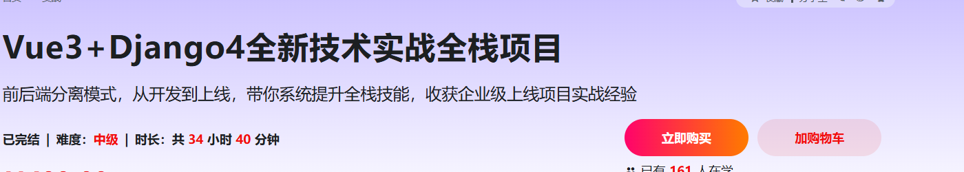 课程简介:本课程采用全新全栈技术Vue3+Django4,前后端分离开发模式从0到1实战全栈项目,带你系统提升全栈技能、提升把控全局能力与架构设计思维,掌握DRF微服务理念与实战能力,收获企业级上线项目实战经验。