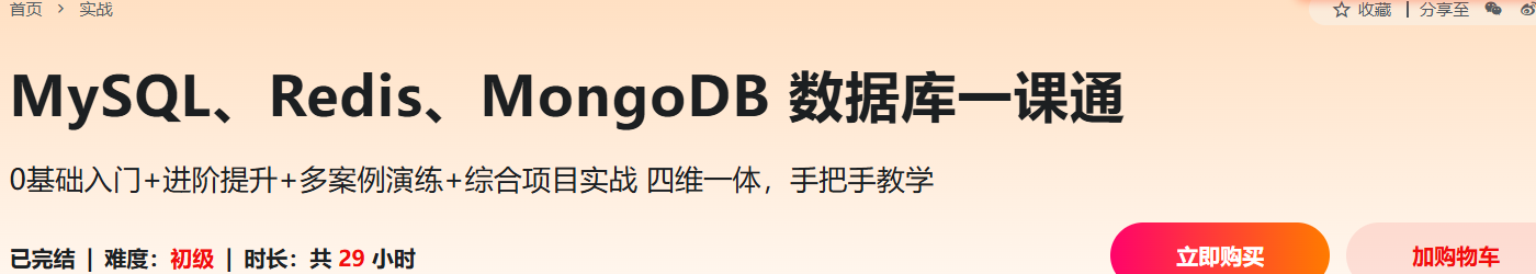 只会一种数据库,很难有机会参与大型复杂项目,三大数据库对比学习,让你快速脱颖而出, 全面提升个人竞争力。本课程带你从0基础入门,稳步进阶,掌握数据库核心技能,多案例实操帮你提升数据库应用能力,MySQL、Redis、MongoDB 三大数据库综合项目实战,还原企业开发多数据库应用场景,落地综合实战能力。三大主流数据库,一课搞定!