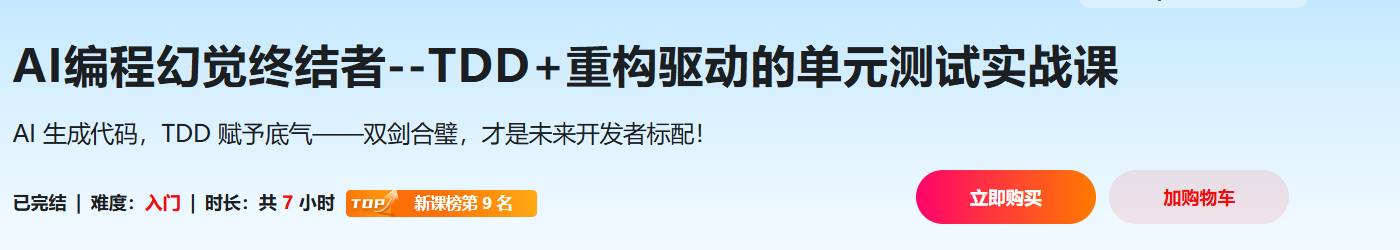 AI 生成代码虽快,却依然存在不小的幻觉问题导致质量隐患,TDD 是目前唯一锁死正确性的低成本方案。本课教你把两者结合:写 Prompt→AI 出码→断言秒级回归→缺陷率压到极低,个人产能暴涨 3× 以上。你带走的不仅是一套可复制的“零回归”流水线,更是一份可写进简历、可面试议价、可加薪的硬核指标——谁先掌握,谁就更有机会拿到未来 3 年技术招聘的通行证。