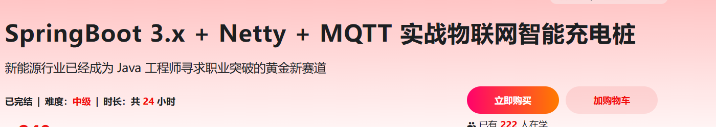 本课程专为想更低成本、更高效率入行/转行物联网-新能源领域的Java开发者量身打造。课程以SpringBoot 3.* + MQTT + Netty 为核心技术,手把手带你实现《新能源车智慧充电桩》项目,让你循序渐进,系统掌握数据传输与解析、持久连接通信、高效数据处理、时序数据库应用等物联网开发核心技能;强化物联网开发设计思维;倍增物与物、物与云端平台通信交互落地实战力,助你更高效实现高薪能力跃迁。
