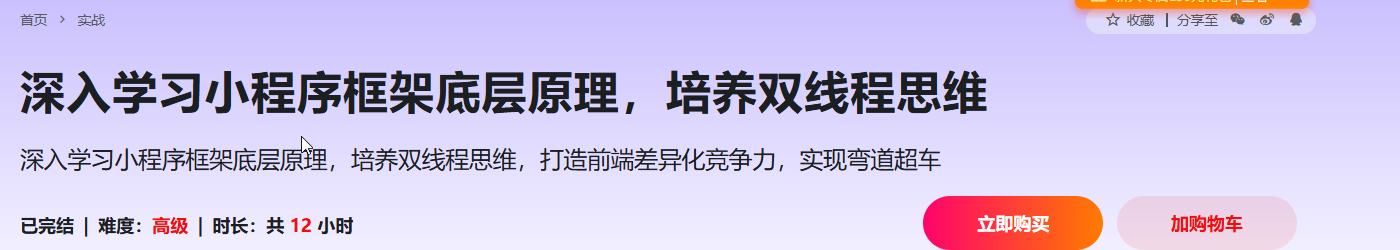 无论你是一位新手,还是一位有经验的开发者,能够自研一套小程序底层框架,都是你突破技术瓶颈有效途径。在本课程中,由曾参与主持小程序框架自研工作的小默老师,带领大家从架构设计 ,原理剖析,再到源码的实现,一步步地实战构建一个完整的微信小程序底层框架,让你深度掌握小程序双线程原理,助力你具备把握最佳机会的能力和提升获取心仪Offer的成功率,成为一个真正有实力的技术人才 。