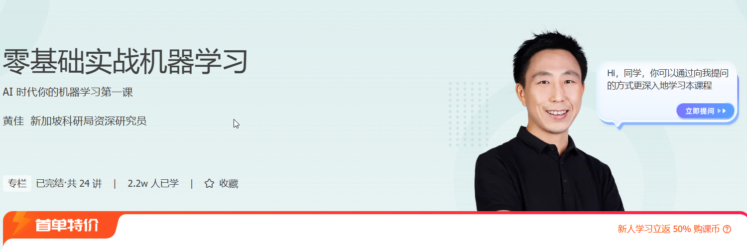 你是否想从零开始掌握机器学习,快速迈入人工智能领域?本课程《零基础实战机器学习》正是为你量身打造。通过真实电商项目“易速鲜花”的五大业务场景,你将系统学习线性回归、决策树、随机森林、XGBoost、CNN、RNN 等 9 大主流算法,亲手完成从数据预处理到模型部署的全流程实战。