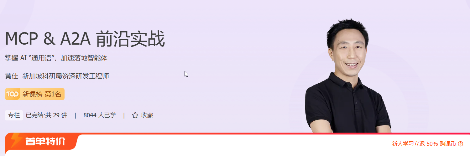 为了帮助你快速熟悉 MCP 与 A2A 协议核心原理,学会灵活运用这些协议开发 Agent,系统高效地提升自己的智能体开发实战能力,我们邀请了黄佳老师开设这门课程。