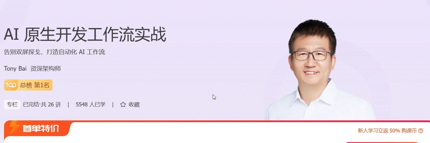如何做到这一点呢?资深架构师 Tony Bai 有一套前沿、可落地的 AI 原生开发方法论,可以帮助你将软件工程知识与 AI 能⼒有机结合,实现从“AI ⼯具使⽤者”到“AI 工作流指挥家”的⻆色转变,构筑你在 AI 时代的个人核心竞争力。