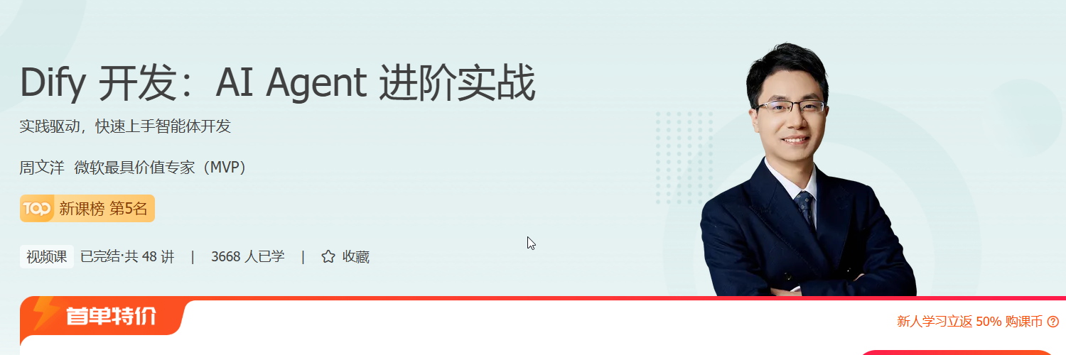 《Dify 开发:AI Agent 进阶实战》是一门聚焦人工智能前沿方向的精品课程,带你深入 AI Agent 设计与开发核心,把握智能体技术演进趋势。课程内容涵盖 AI Agent 原理、Dify 框架搭建、智能体产品设计及实战开发全流程,结合 AI 题助手、智能选股、课程客服等真实项目案例,全面掌握数据抓取、模型部署、插件开发与工作流编排等关键技术。通过学习,你将具备独立开发智能体的能力,提升 AI 工程化实战水平,增强在 AI 产品设计、智能系统开发等岗位的竞争力,助力职业进阶与技术跃迁。