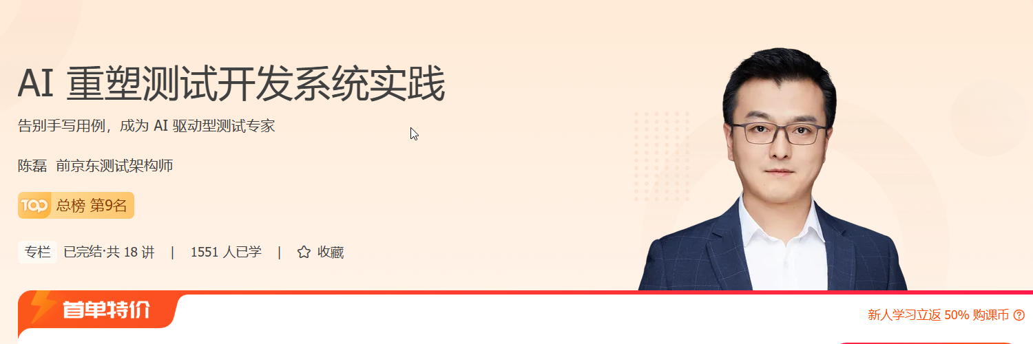 焦虑是成长的开始,行动是突围的唯一路径。前京东中台测试架构师陈磊将以测试开发工程师视角,层层递进,从基础理论到进阶实践,再到实战落地,带你系统掌握大模型的核心知识与应用技巧,构建智能化测试体系,拥抱 AI 驱动的未来测试时代。