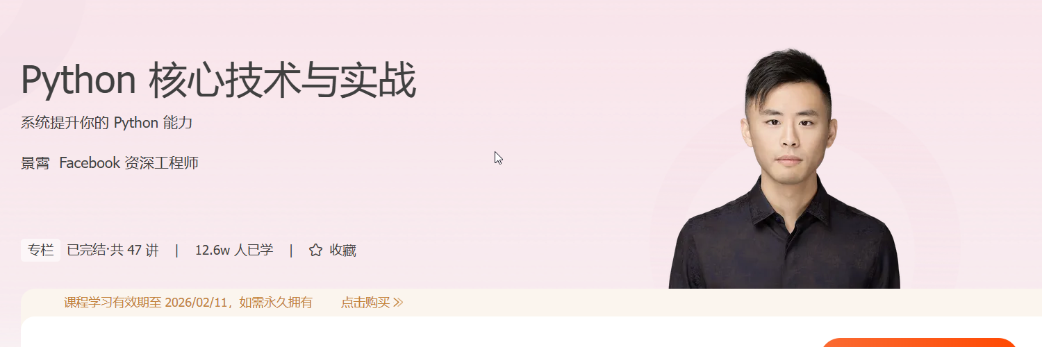 在人工智能迅猛发展的今天,Python 已成为该领域不可或缺的核心工具。《Python 核心技术与实战》课程由 Facebook 资深工程师景霄主讲,专为希望在 AI 领域深耕的学习者打造。课程从工程实践出发,系统讲解 Python 在人工智能开发中的关键能力,涵盖基础语法、高级特性、代码质量、实战开发与职业成长路径,助力你构建扎实的工程能力。