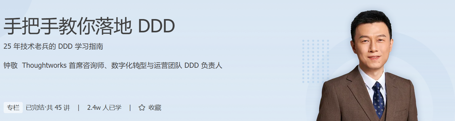 为此,我们邀请了 Thoughtworks 首席咨询师钟敬老师,带你扫清以上学习障碍。钟老师将结合自己多年的项目实践经验和培训经验,带你循序渐进地学习、训练。跟着课程一步步建模型、写代码,拾级而上,你将深刻理解 DDD 的重要概念、原理,掌握 DDD 最核心的技能。