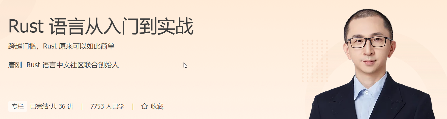 为此,我们邀请到 Rust 专家唐刚老师,结合他多年深度使用及传播 Rust 的经验,通过大量示例与实践,带你突破这些关键关卡,让你在掌握 Rust 基础知识与语法特性的同时,习得 Rust 特有的编程理念,学会使用 Rust 上手开发,用 Rust 解决生产实践中的问题。