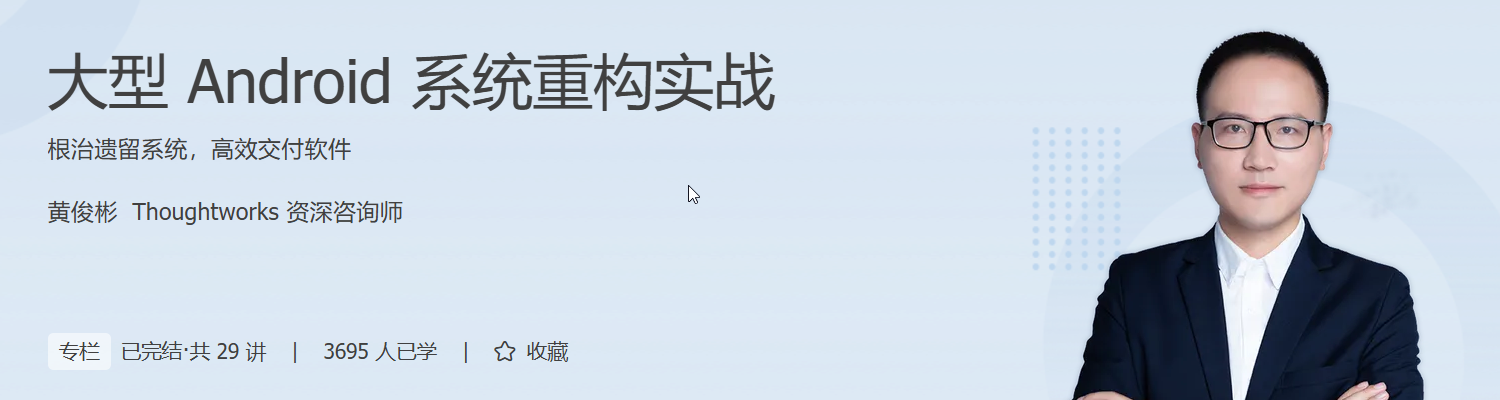 为了解决上述问题,我们邀请了在大型遗留系统领域深耕多年的黄俊彬老师开设这门课程,让你掌握大型 Android 遗留系统的架构演进与重构思路、方法和一线开发经验。课程将围绕一个贴近实际工作的 App 项目,带你在实战演练中,体会单体架构演化为组件化架构的过程。