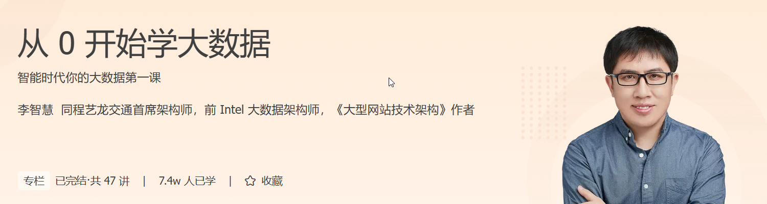 在这个专栏里,李智慧将结合自己多年大数据开发、应用的经验,帮助你构建一套立体化的知识体系,并从不同视角、不同领域带你找到你在大数据领域的突破口,真正从普通开发者晋升为拥有大数据思维并能解决复杂问题的技术专家。