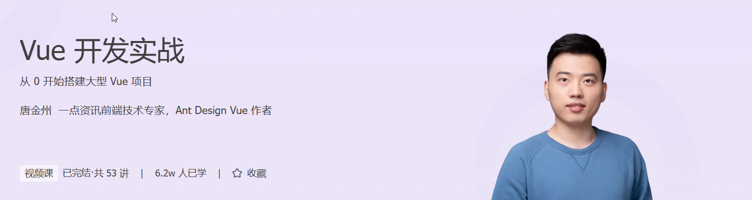 你是否想从零开始掌握 Vue 开发,真正具备构建大型前端项目的能力?本课程由 Ant Design Vue 作者唐金州亲自讲授,以“实战 + 原理”双线并进的方式,带你系统掌握 Vue 全家桶核心技术。从组件开发、虚拟 DOM、生命周期到 Vuex 状态管理、Vue Router 路由控制,再到真实项目中的权限管理、动态布局、Mock 数据开发等实战内容,层层递进,直击前端工程化核心。你将亲手搭建 Ant Design Pro 项目,掌握 GitHub 持续集成、组件发布到 npm 等高阶技能,全面提升开发效率与工程化能力。无论你是想进阶 Vue 技术栈,还是瞄准中高级前端岗位,这门课都将助你打通任督二脉,实现技术跃迁。