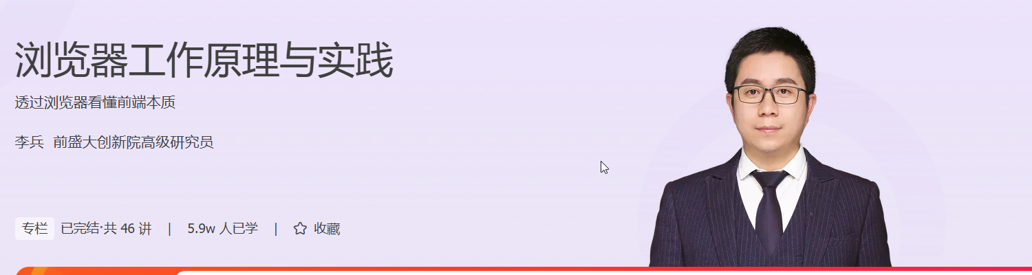 在这门讲解浏览器工作原理的课程中,李兵会用深入浅出的讲解方式、图文并茂的展现形式,把网络、页面渲染、JavaScript、浏览器安全等知识串联起来,从而让你高质量、高效率地学习这门课程,系统掌握浏览器工作原理,并同时把理论应用到前端实践中去