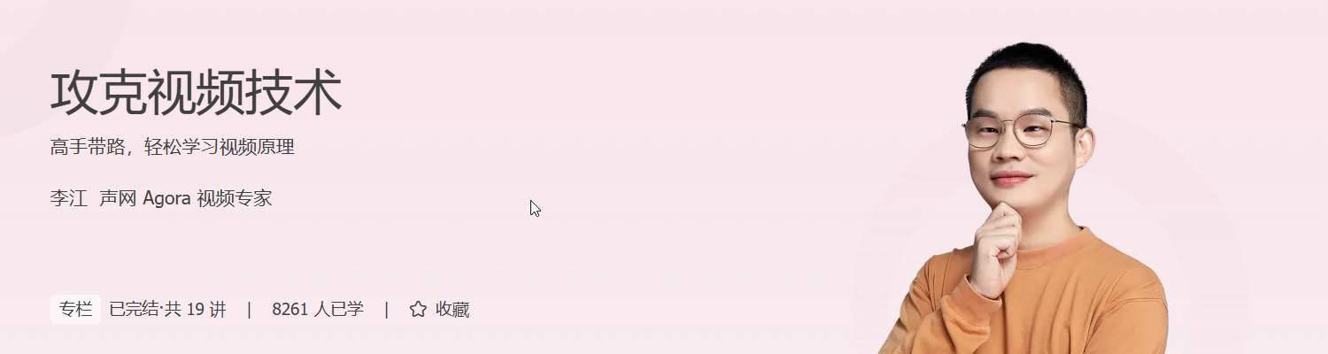 基于此,我们邀请到了声网 Agora 视频专家李江老师联合开发课程,将他在视频领域多年的积累和实践,按照学习重难点梳理、问题复盘的方式交付给你,重点就包括视频底层原理解析和工程中遇到的实际问题。学习之后,你将对视频处理全链路有一个系统的了解!