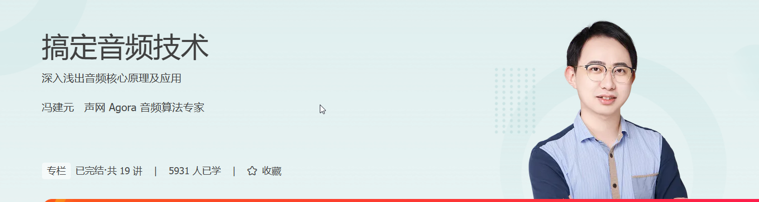 基于此,我们邀请到了声网 Agora 音频算法专家冯建元老师联合开发课程。通过学习,你能知晓音频处理的全套链路和音频发展的脉络、方向,而关于音频技术学习中的重要原理及常见问题的解决方案,你也能一探究竟。这些知识不但可以让你用于职业工作,也可以加强你对生活中声音的感知,从而知道应该听什么、怎么听。甚至怎么去让声音发生变化,从而为你打开“百万调音师”的潘多拉宝盒。