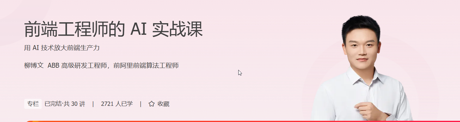 为此,我们邀请了长期深耕在 AI + 前端领域的柳博文老师,推出这门前端工程师的 AI 实战课,让你用最高效的方式建立对 AI 技术的清晰认识,给你带来技术和经验的双重收获
