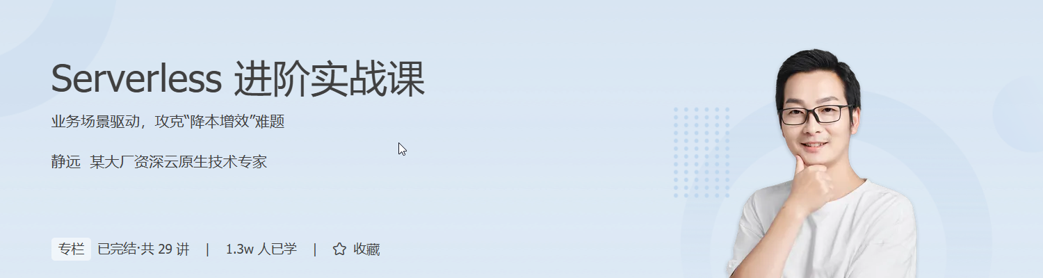 为此,我们特地邀请到了静远老师,以 FaaS 形态的 Serverless 为切入点,为你梳理 Serverless 的核心技术与原理,结合丰富的实战案例,打通 Serverless 进阶实战的完整学习路径。希望这样的聚焦方式,能够帮你养成举一反三的习惯和能力,实现 Serverless 从小白到专家的突破。