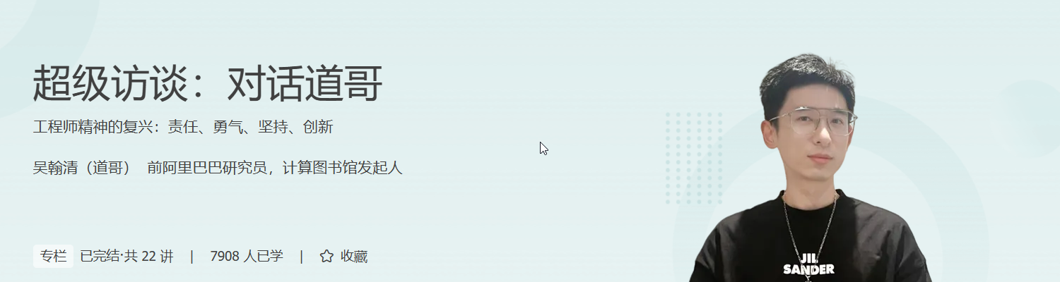 你是否想过,人工智能的未来究竟由谁来定义?《超级访谈:对话道哥》带你走进前阿里研究院吴翰清的深度思考,探索技术人如何在 AI 浪潮中站稳脚跟、引领变革。课程从技术成长、计算主义世界观到未来工程师的判断与行动,层层递进,揭示人工智能背后真正的底层逻辑与工程思维。