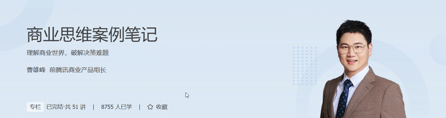 因此,我们特意邀请了雄峰老师,他会以类似的问题作为牵引,将丰富的案例与商业知识结合,讲述商业运行发展背后的逻辑和规律,帮助我们提升理解并分析世界的能力以及提升决策正确性的能力。不管我们是打算在职场持续发展,还是做跳槽及业务的选择,还是为创业积攒能力,商业思维都可以助力我们更上一层楼。