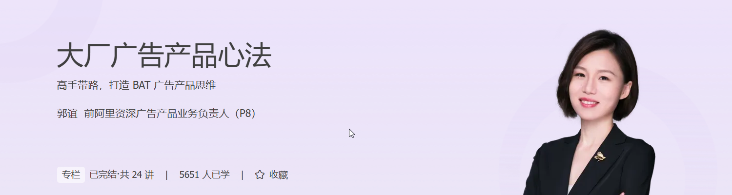 郭谊老师,曾先后在阿里巴巴、腾讯、百度、新浪等互联网大厂担任互联网广告产品及运营方面的工作。她将把自己十余年的行业经验,通过专栏的形式呈现出来。在内容设计上,她将广告产品的基础知识、技术原理与在大厂的成功经验做结合,梳理出了 20 个最核心的问题,并将这 20 个问题分成了三个模块。