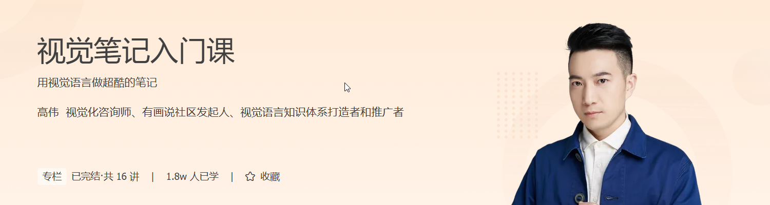 在这个信息爆炸的时代,高效表达与结构化思维已成为职场与生活的核心竞争力。《视觉笔记入门课》正是帮你掌握这项能力的利器。课程由视觉化专家高伟打造,无需绘画基础,就能让你学会用视觉语言清晰传达复杂信息。从点线面到人物、图标、色彩、构图,课程系统拆解视觉笔记的各个要素,再通过图书与会议笔记的实战项目,让你真正“把知识画出来”。你将学会用视觉结构梳理逻辑,用图形提升表达吸引力,这项技能不仅能提升你的学习效率,更能增强你在团队沟通、汇报展示等场景中的表现力。掌握视觉笔记,就是掌握一种全新的思维方式,让你在职场进阶中脱颖而出。