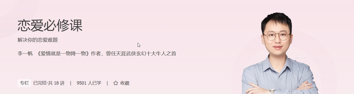 为此,我们邀请了李一帆老师,他曾在校内网和天涯社区连载了“金庸教你谈恋爱”,受到了大量网友的喜爱,被评选为年度天涯社区武侠玄幻十大牛人之首。后来更是出版了情感畅销书《爱情就是一物降一物》。他还有着多年的情感咨询经验,长期提供关于亲密关系建立和维护方面的咨询服务,接触了大量各类案例,有丰富情感咨询经验。