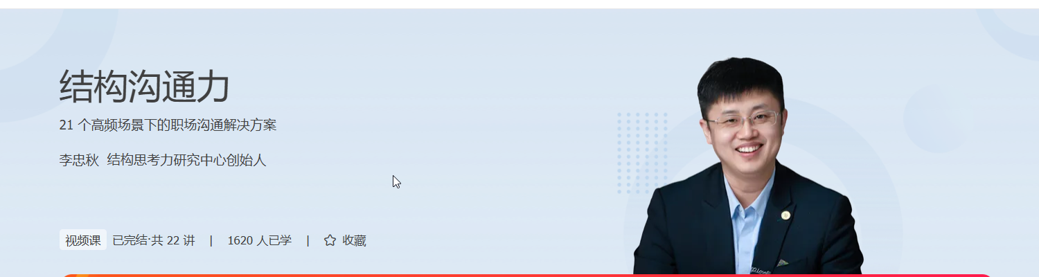 这门课程为极客时间精选合作课程,来自「结构思考力研究中心」。李忠秋老师将带着你深入工作中的具体场景,通过写作、表达、呈现三个部分,解决你 99% 的职场难题。为自身赋能,助力组织统一语言、高效沟通。