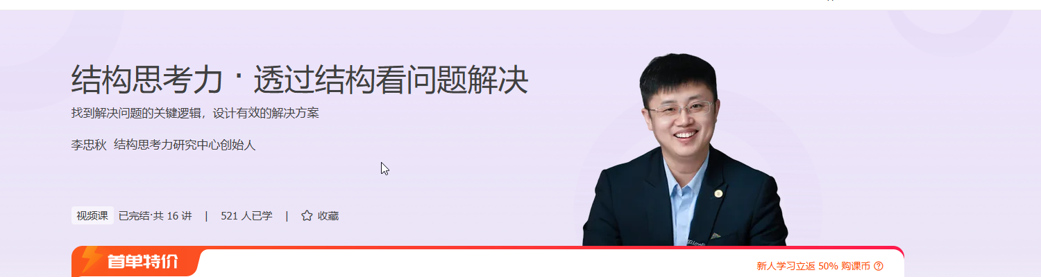 这门课程为极客时间精选合作课程,来自「结构思考力研究中心」。李忠秋老师将带着你透过结构扒开“问题”的伪装,多视角看清其本质。同时,让你对“问题”建立正确的认知,在面对它时,能够系统思考,合理运用工具,对“问题”进行界定、拆解、重构,找到关键逻辑,设计可行方案,制定实施计划。