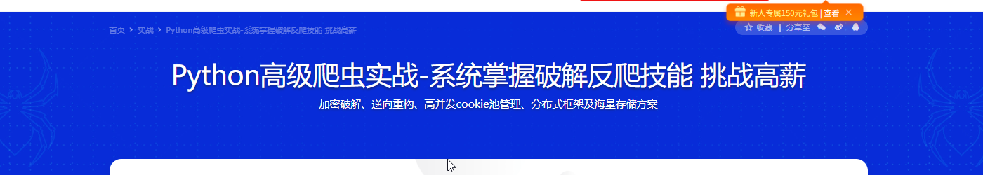 对爬虫工程师来说,突破反爬是一项重要但并不容易掌握的工作能力,因为反爬涉及的技术领域广泛,知识庞杂,网上也缺乏体系教程。不过别担心,本课中,爬虫技术专家带你深度了解Web端反爬策略,并教你用多手段、多方法破解反爬技术,向高级爬虫工程师晋级,挑战高薪。